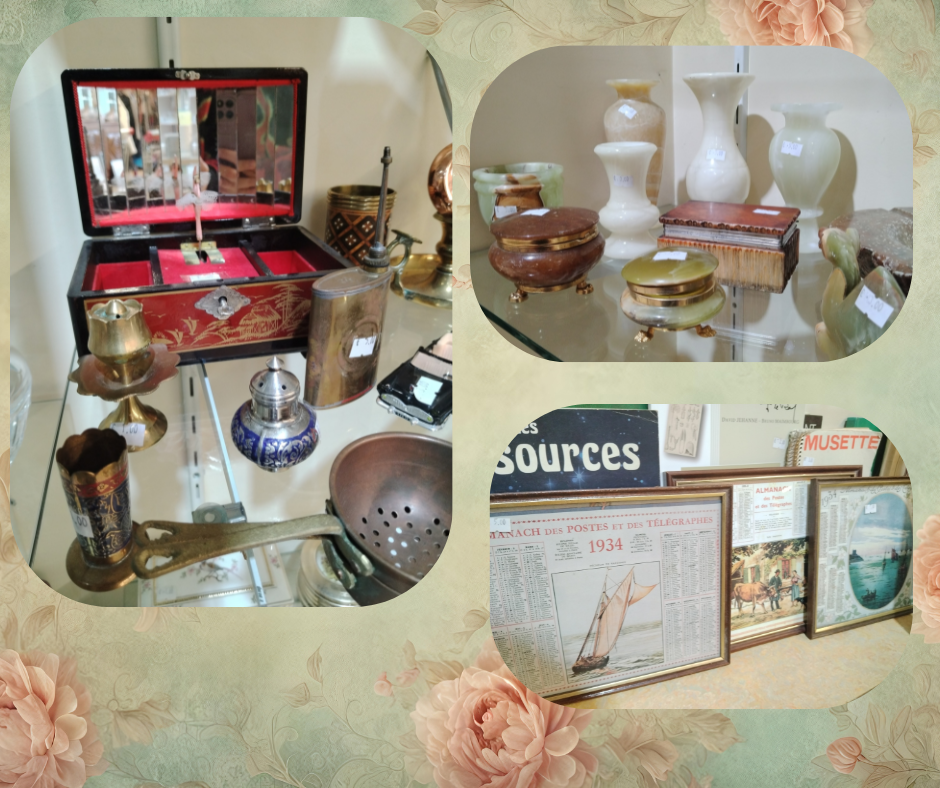 Découvrez notre sélection composée d'une boîte à musique ancienne, de vases et décorations en albâtre, de décorations en cuivre ainsi que des calendriers d'une autre époque, soigneusement exposés en vitrine.