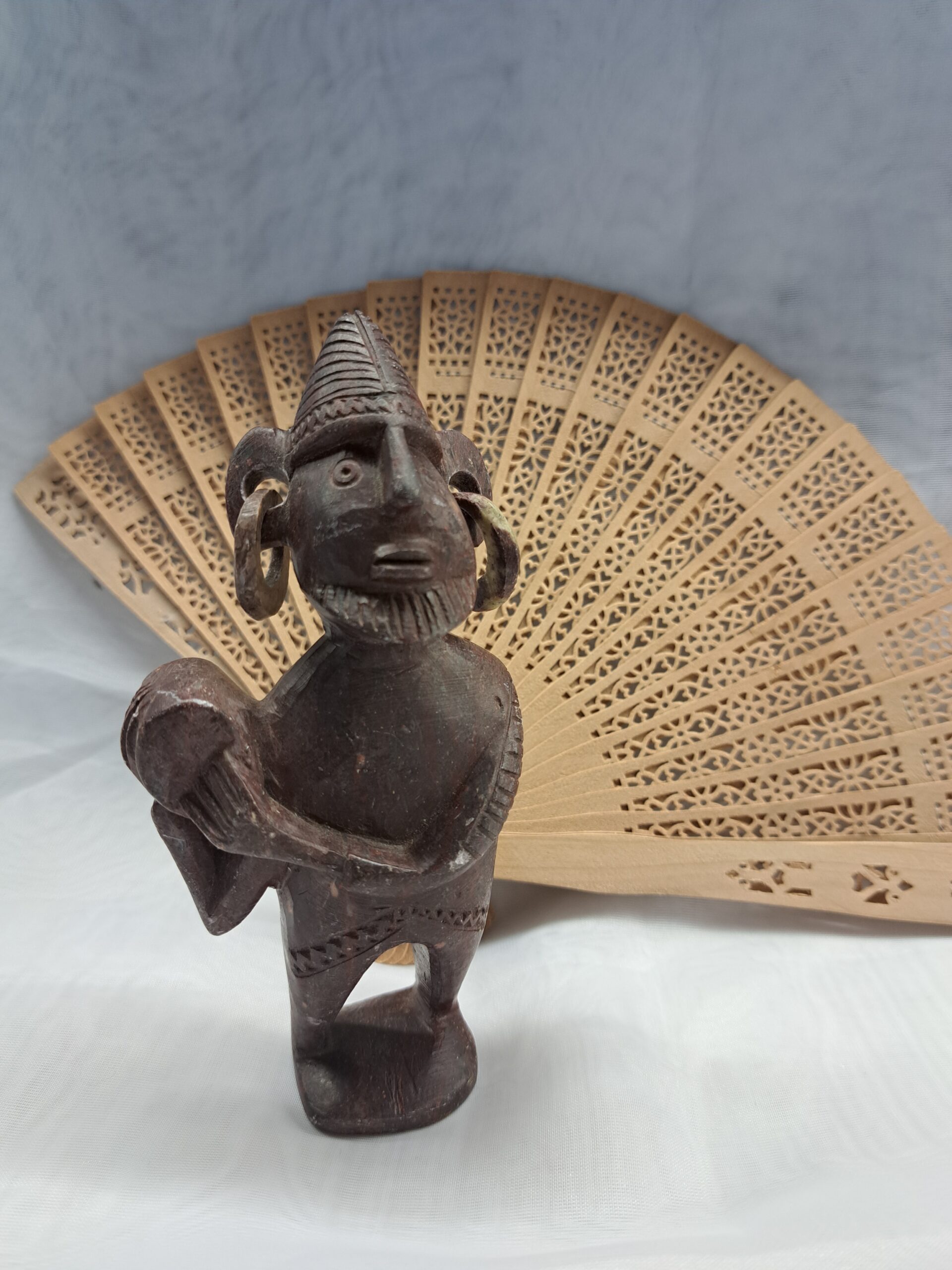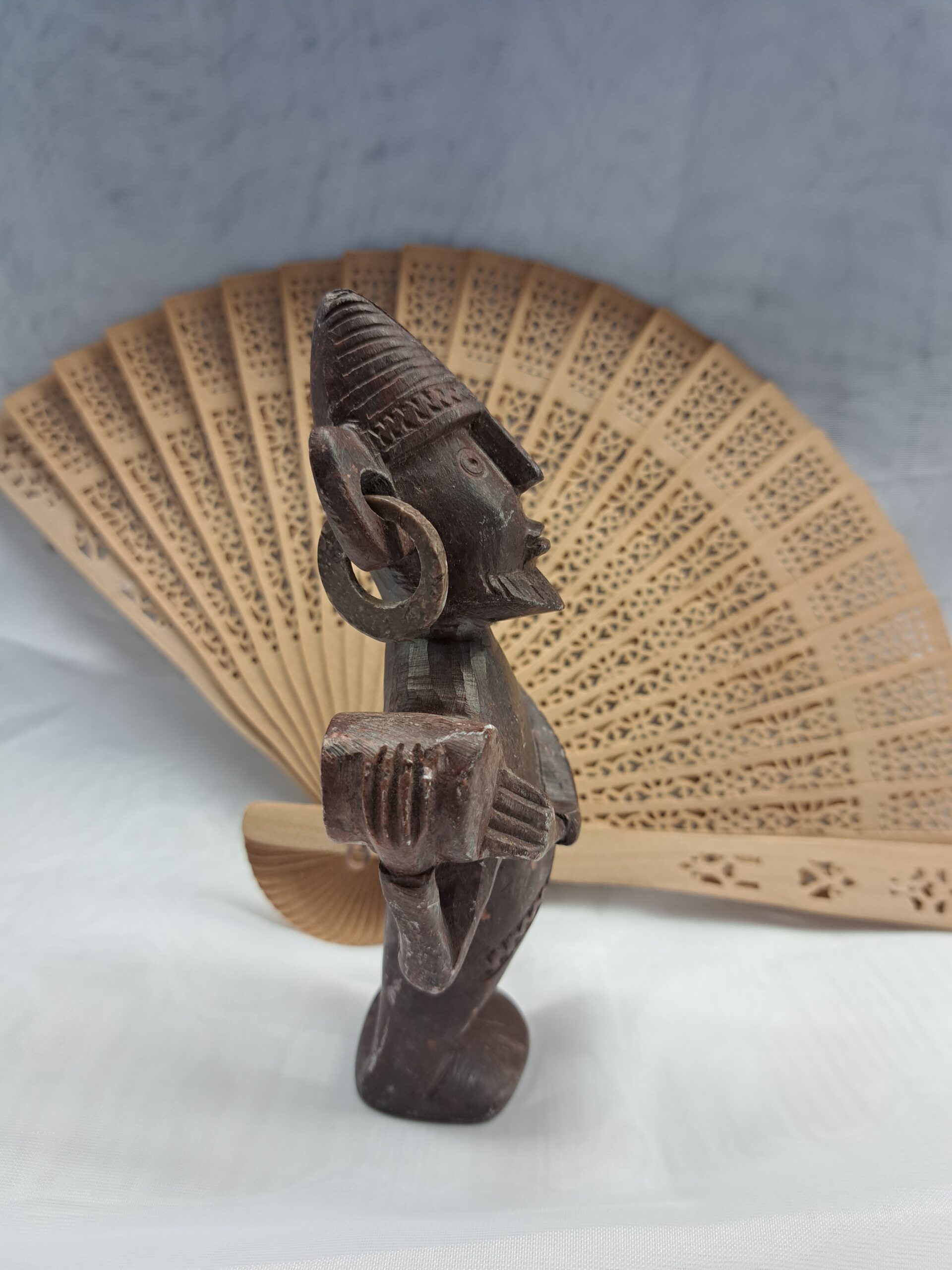 Sublimez votre décoration avec cette pièce de caractère, entièrement sculptée dans la pierre. Représentant un musicien traditionnel, cette statuette brute se distingue par sa patine naturelle et ses détails soignés, comme ses anneaux d'oreilles mobiles. Une œuvre authentique qui apporte une présence minérale et historique à votre intérieur.